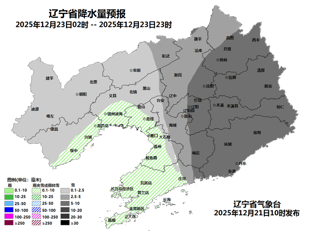 23日2时至23日23时,沈阳东部、抚顺、本溪、丹东、辽阳中东部、铁岭大部区域及鞍山市区、岫岩和沈抚演示区有大雪(降雪量5~10毫米),新增积雪深度4~8厘米,其他当地小雨或雨夹雪转小雪到中雪(降雪量1~5毫米)。