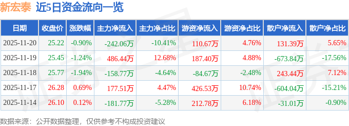 11月20日的资金流向数据方面,主力资金净流出242.06万元,占总成交额10.41%,游资资金净流入110.67万元,占总成交额4.76%,散户资金净流入131.39万元,占总成交额5.65%。